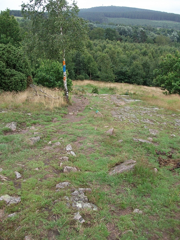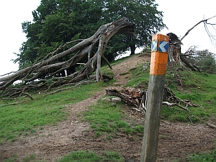 Das Wetter schien sich etwas zu bessern, denn der Regen ließ nach und es kam zeitweise sogar die Sonne heraus. Die Strecke aber war zum verzweifeln. Endlose Geraden zwischen den Feldern, immer auf und ab. Dazwischen kurze Trailabschnitte, die mit hohem Gras immer wieder für nasse Füße sorgten. An einem Zaun, den wir überklettern mussten lauerte uns ein Hund auf, der sich aggressiv knurrend in unseren Weg stellte. Alles zureden half nichts, der Hund wollte uns nicht durchlassen. Letztlich konnte ich ihn mit meiner extrem lauten Signalpfeife verscheuchen. Schnell kletterten wir über den Zaun.