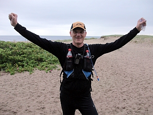 Im Regen durchquerten wir Börsarp und gelangten schnell wieder auf den Trail. Durch den Wald und über Wiesen ging es stetig auf und ab und so gelangten wir bis zur Küste. Kurz vor dem Wendepunkt trafen wir Neil und Svante, die bereits auf dem Rückweg waren. Am Wendepunkt trafen wir Dermot und Ole, die gerade bei Ihren Supportern Pause machten. Schnell gingen wir zum Strand, machten ein paar Fotos und machten uns auf den Rückweg. Zwei Plätze hatten wir bereits aufgeholt.