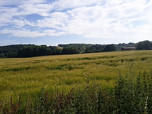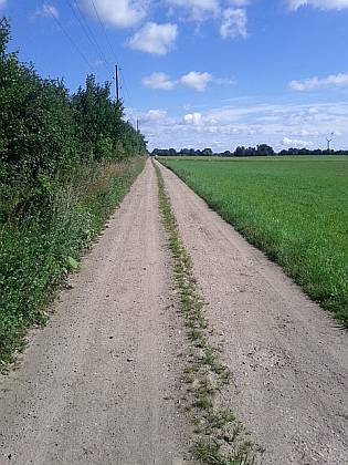 Die Strecke folgt jetzt einer Straße in ein Tal und dann steil bergauf und dann wieder auf einen Feldweg. Kilometerlang winden sich die Feldwege durch die Felder und Weiden. Im stetigen Wechsel geht es auf und ab. Plötzlich sehe ich Bjarne vor mir. Er hat sich von Ola getrennt und ist jetzt allein unterwegs. Wir schließen und zusammen und unterhalten und gut, während wir auf Lövestadt zulaufen.