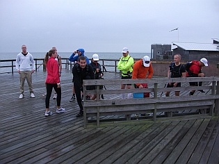 Während wir am Strand warten beginnt es leicht zu regnen. Keiner der Läufer zeigt besondere Reaktionen, alle haben mit Regen gerechnet. Pär, der Rennleiter, gibt noch einmal letzte Instruktionen und Hinweise bevor wir uns gemeinsam auf den langen Badesteg begeben, an dessen Ende der Start erfolgen soll.