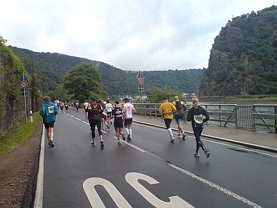 Ziemlich spontan entschloss ich mich, Tatjanas Geburtstagsfeier mit Franks Idee, am Abend zuvor den Marathon zu laufen, zu verbinden. Der Hamburg Marathon lag erst 6 Wochen zurück und ich hatte noch nicht wieder mit dem ambitionierten Laufen angefangen, eher nur so ein paar Runden zum Spaß gedreht. Doch „Spaß“ war auch der Grundgedanke dieses Laufes, und als ich hörte, dass auch Iris und Oliver sich meinem langsamen Lauftempo anpassen wollten, freute ich mich umso mehr. Von den Sehenswürdigkeiten entlang der Strecke hatte ich schon gehört und gelesen und unkte vorher noch herum, dass wir passend zur Loreley ja „Ich weiß nicht, was soll es bedeuten“ singen könnten. Da wusste ich noch nicht, dass es mit dem Gesang unterwegs Wirklichkeit werden würde!