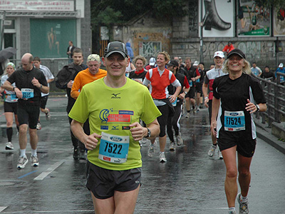 Die Halbmarathonzeit war mit 2:03:17 Stunden meine beste je erreichte. Ich hatte mich warmgelaufen und meinte noch zu Frank, dass ich inzwischen bestimmt einen hochroten Kopf hätte. Kein Kommentar (Erst nach dem Lauf erzählte er mir, dass ich zu diesem Zeitpunkt schon ziemlich blass um die Nase war). Einige Kilometer später fragte er mich, ob ich Kreislaufprobleme hätte. Ich horchte in mich hinein, merkte natürlich schon den „Mann mit dem Hammer“ näher kommen (den kannte ich ja schon) und Frank machte mir Mut, dass man die „Mauer“ ja irgendwann auch wieder hinter sich lässt. Das stimmte auch, aber dieses Mal leider nur für kurze Zeit, dann machte sich ein flaues Gefühl in der Magengegend breit. Ich mochte nichts mehr essen oder trinken und verlor zunehmend Kraft. Das Tempo war nicht zu halten, meine Gedanken kreisten um die Erkältung, die ich vor zwei Wochen hatte (war ich doch noch nicht wieder fit?) und fixierten sich immer mehr auf die Muskelverkrampfung im rechten Oberschenkel (eine Folge der Fehlbelastung aufgrund einer Sehnenreizung im linken Fuß vor ein paar Wochen?). Es fiel mir schwer irgendwelche positiven Gedanken zu formulieren und das Laufen wurde zur Qual.
