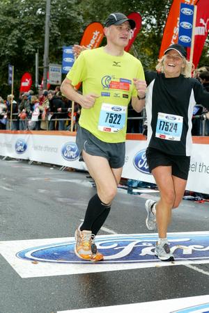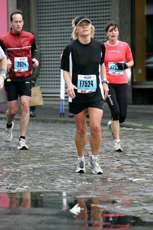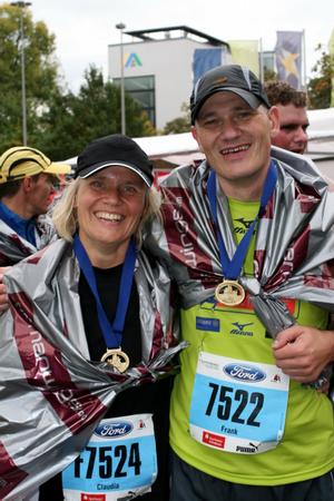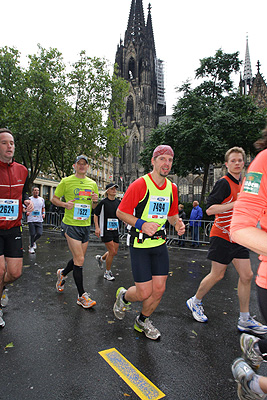 So hatte ich mir meinen zweiten Marathon nicht vorgestellt! Ich nahm kaum noch wahr, wie wir Kilometer um Kilometer hinter uns brachten, dabei hatte ich doch die Stimmung und das Publikum genießen wollen! Den Gedanken an eine Gehpause schob ich sofort zur Seite, erstens würde es meinem Kreislauf auch nicht besser gehen und zweitens bezweifelte ich, dass ich wieder „anrollen“ könnte. (Kurz vor dem Ziel – nach dem Dixi-Klo – machte ich die Erfahrung, dass ich doch wieder loslaufen konnte, auch wenn ich in diesem Moment die völlig verspannten, schmerzenden Muskeln besonders deutlich spürte). Als die Deutzer Brücke in Sicht kam, steckte ich mir ein Stück Traubenzucker in den Mund, das sich nicht einmal ansatzweise auflöste, so trocken war die Schleimhaut. Also zerbiss ich es mit der Folge, dass sich prompt mein Magen wehrte. Zum Glück begann der Zucker rasch zu wirken und die Übelkeit verflog. Nun waren wir auf dem letzten Kilometer, mir ging es besser und ich schaffte trotz eines etwas humpelnden Gangbildes so etwas wie einen Endspurt. Als ich zusammen mit Frank über die Ziellinie lief, war ich vor allem erleichtert, froh und stolz (in dieser Reihenfolge).