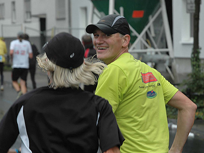 Am Sonntagmorgen machte sich die übliche Nervosität breit, zum Thema Wetter dachte ich nur: „Da müssen wir jetzt durch!“. Tatjana, Lena und Luca packten ihre Regenschirme ein und ließen es sich nicht nehmen uns zu begleiten. Wie schön ist es, wenn die vertrauten Gesichter auf der Strecke auftauchen! Auch Manfred hatte die Absicht aus Heimerzheim anzureisen und bei km 24 auf uns zu warten. Würde er sich vom Wetter abschrecken lassen? – Natürlich nicht! Er stand unter dem gut präparierten und damit weit sichtbaren Regenschirm und machte Fotos. Welche Freude!