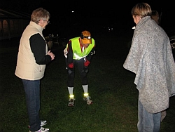 Chris übernahm die erste Radbegleitung, während Svende mit dem Auto ein Stück vorfuhr. Wir trafen uns auf dem Parkplatz vom PENNY Markt wieder, wo ich – inzwischen richtig hungrig – in das „vorbestellte“ Käsebrot biss, mir eine lange Laufhose anzog und nach kurzer Pause weiter lief. Jetzt war Svende an meiner Seite und wir arbeiteten uns zu unserem ersten VP – dem „Wellenbad“ – vor. Inzwischen war es dunkel und kalt, und ich merkte, dass ich zu zittern anfing, während ich dort die leckeren Pellkartoffeln aß. Also noch ein Langarmshirt überziehen, die Stirnlampe einschalten und schnell weiter. Von der Landschaft konnte ich nun nicht mehr viel erkennen, aber dafür zeigte sich am Himmel ein blutroter Mond. Am nächsten VP würden wir Frank und Lena treffen, mit diesem Gedanken munterte Chris mich immer wieder unterwegs auf. Endlich erreichten wir das „Strandhaus Hengsteysee“, wo Svende, Lena und Frank bereits zusammen saßen. So richtig viel essen konnte ich leider nicht, aber die Cola tat gut. Wir wünschten Frank alles Gute für seinen Lauf, der in einer Stunde starten sollte, und machten uns wieder auf den Weg.