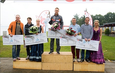 Inzwischen stach die Sonne vom Himmel, sodass Svende mir den aufgespannten Regenschirm als Schattenspender entgegenhielt. Chris fuhr derweil mit dem Auto zum Zielparkplatz und kam uns von dort zu Fuß entgegen, sodass wir die letzten Kilometer zu dritt zurücklegen konnten. Diese Kilometer zogen sich gefühlt unendlich in die Länge. Mein Team vermied es, mir irgendwelche Zwischenstände durchzugeben – es hätte mich nur demotiviert. So schleppte ich mich über Deiche und Brücken, bis endlich der Zieleinlauf in Sicht kam: Erst das Rheinorange, dann der Pavillon und zuletzt der Weg durch die Wiesen. Hier erwartete uns Lena mit der Kamera. Schöne Fotos! Schnell noch das Fahrrad abgestellt, und dann kamen wir Hand in Hand an – Glück pur und das erlösende Anschlagen am Rheinorange. Ich bekam eine fette Medaille um den Hals gehängt und wurde von Jens anschließend mit der Riesenüberraschung konfrontiert, dass ich den 3. Platz der Frauen gewonnen hatte. Ich konnte es nicht glauben (kurze Nachfrage: „Dritte von drei?“ wurde so nicht bestätigt). Noch schnell ein paar Fotos, dann langsam zurück. Ich legte mich ins Gras, entspannte meine Füße (wovon ich in den letzten Stunden zunehmend geträumt hatte) und blickte in den blauen Himmel. Die Endorphine tanzten. Einfach unvorstellbar!