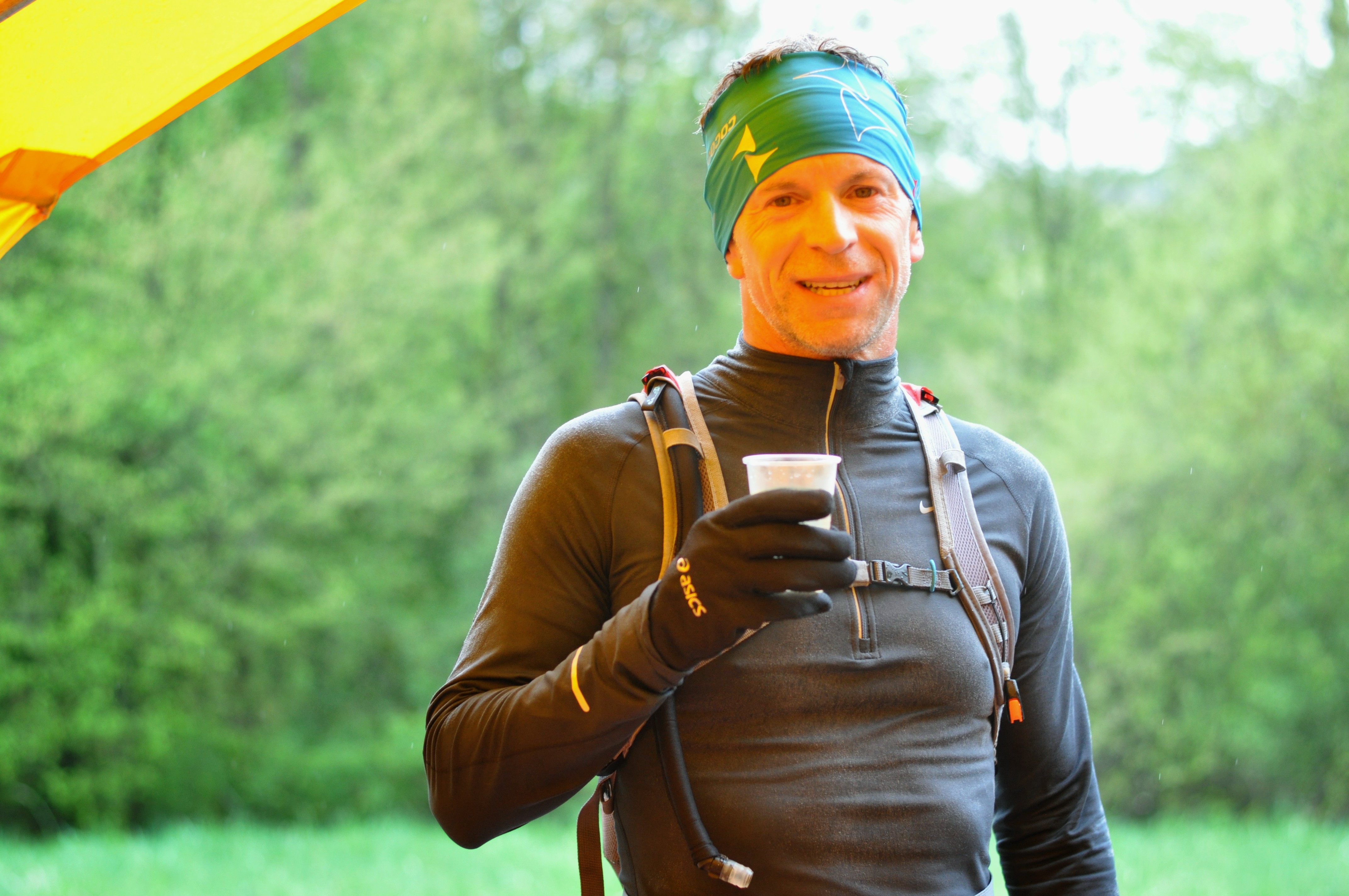 Oberkörper freimachen, schnell was Trockenes drüber. Alles etwas eng und chaotisch hier. Und dann packt ein Läufer, mit leuchtenden Augen, neben mir seine Müller-Milch Schoko-Kaffee aus und es passiert, was passieren musste: Schwups, aus der Hand auf den Boden…klatsch…ein großer Schwapp, die klebrige Masse landet auf meinem Rucksack und meiner Windjacke. Ein gutes Gefühl für die kommende Nacht. Hilft ja nix, weiter geht’s mit Schoko-Rückenwind. ?